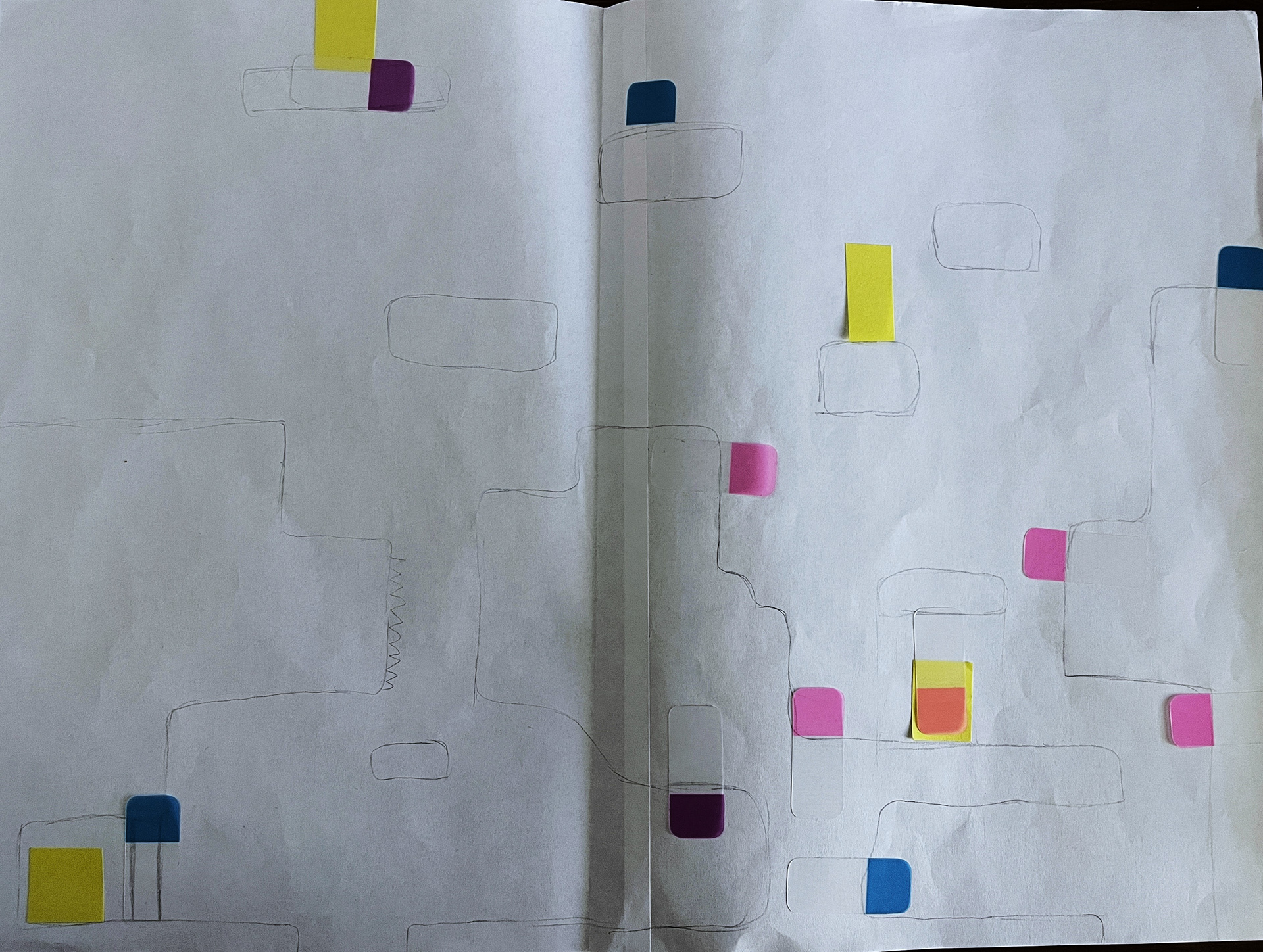 Die gelben Post-Its entsprechen den Schreinen und die farbigen entsprechend Bestandteilen der Puzzels - Schlüssel, Schalter usw.